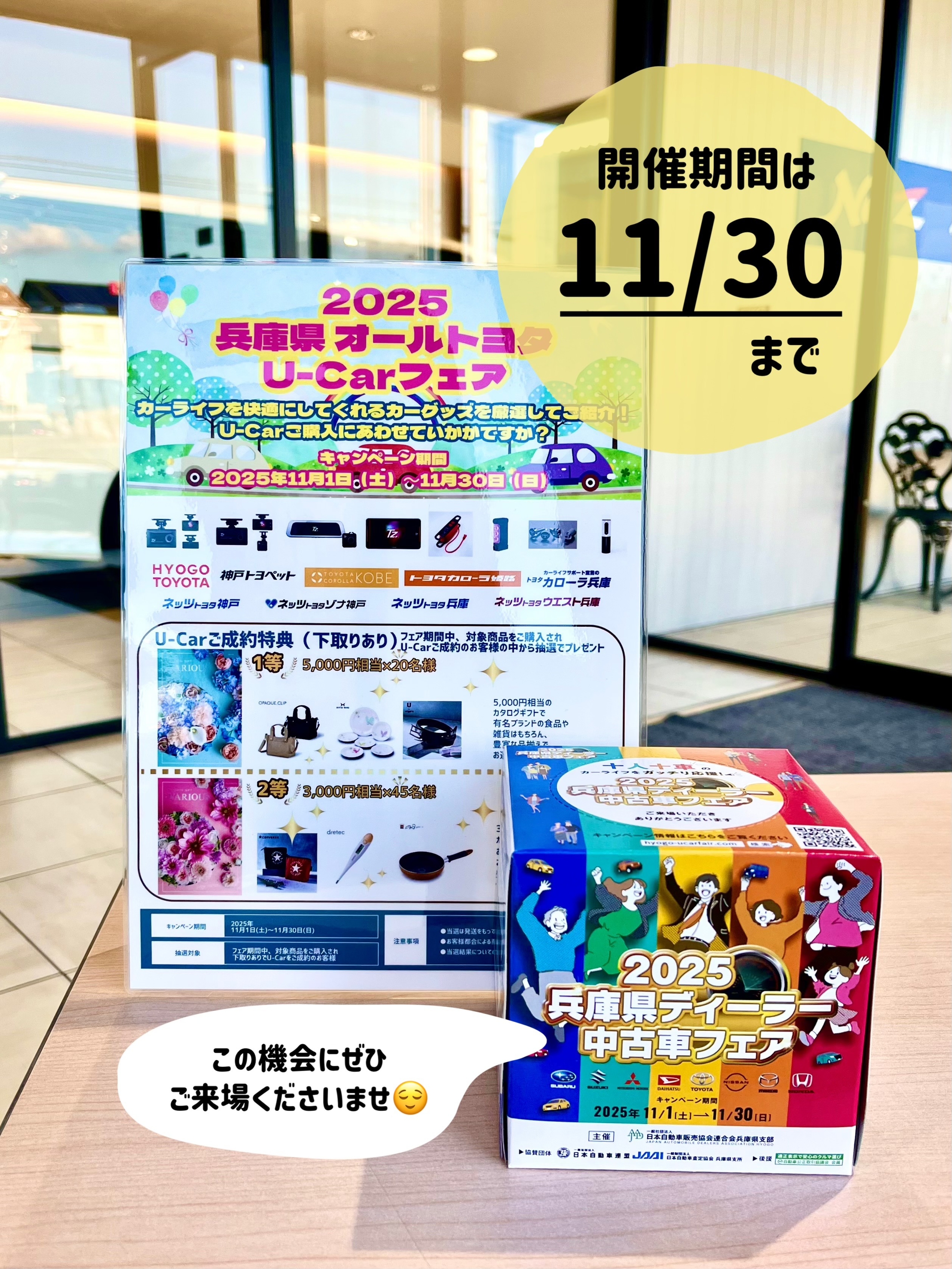 現在、兵庫県ディーラー中古車フェア&兵庫県オールトヨタU-Carフェアを開催しております🎇