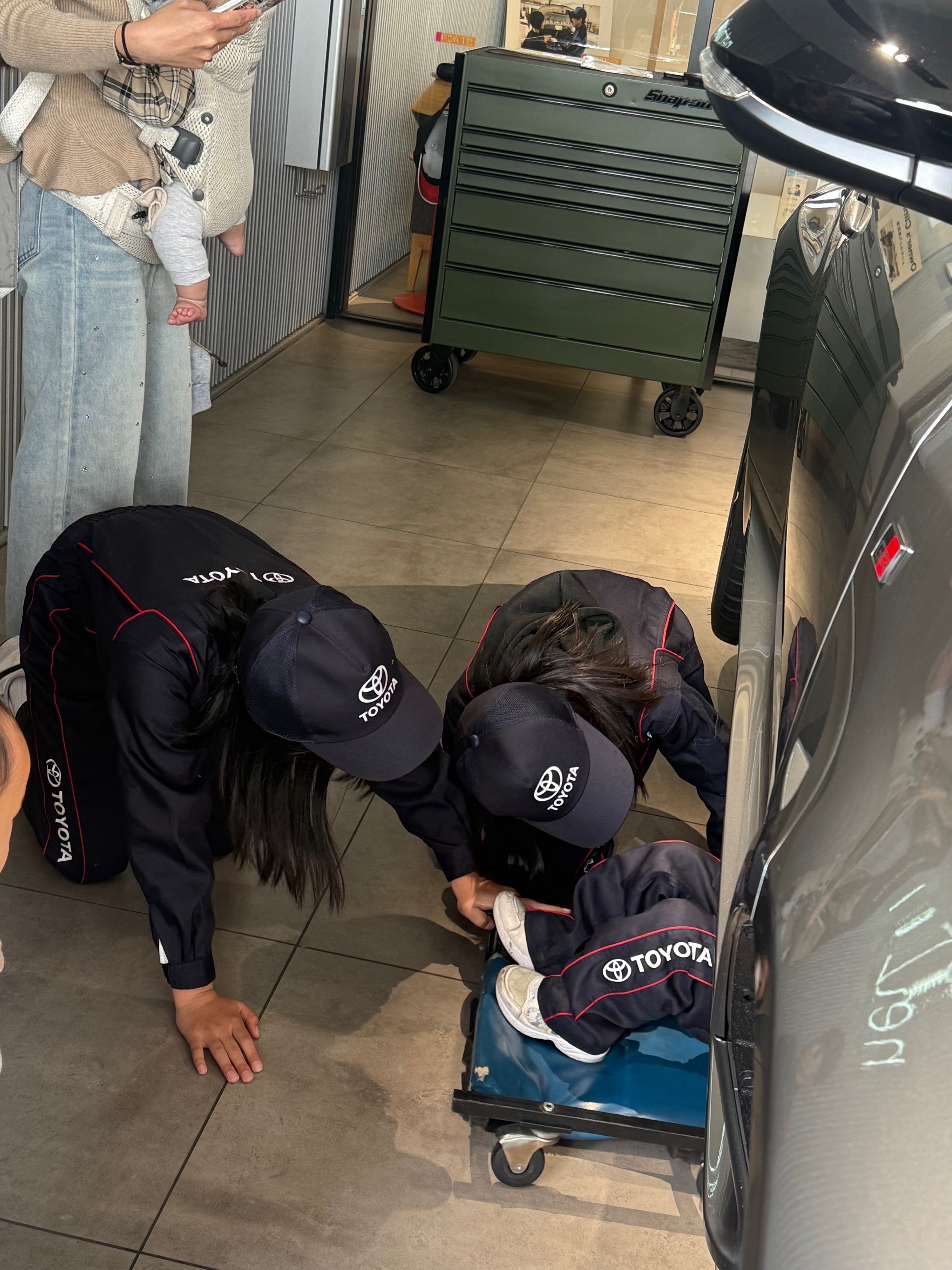 つなぎ姿に着替えて 工具に触れながら 車の仕組みを学んだり車の下にもぐって普段見えない部分をのぞいてみたり